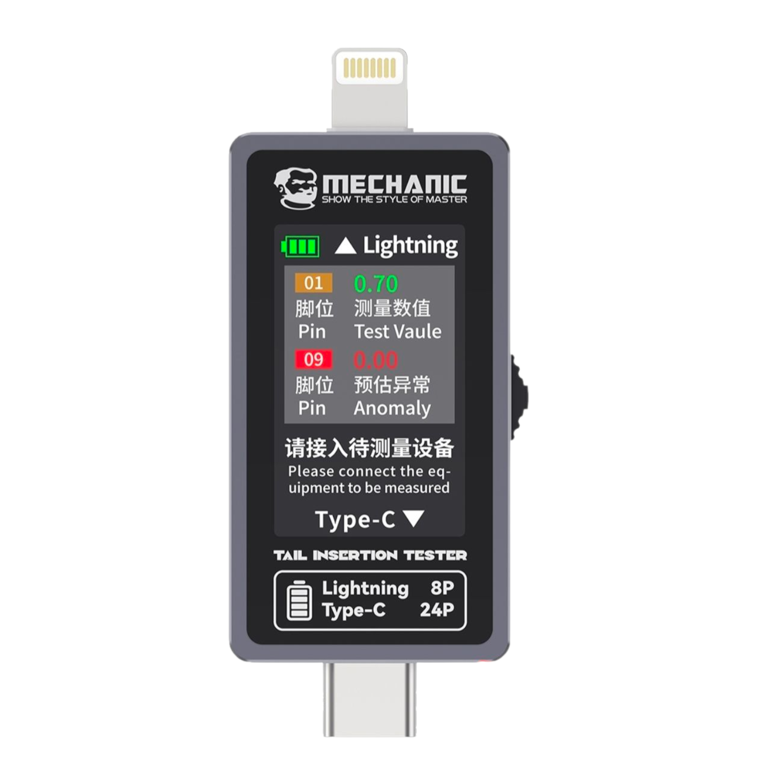 Take the guesswork out of tail-connector testing. The T-824 lets you instantly check Lightning and USB-C “tail” (dock-port flex) insertion and power status—no disassembly required.